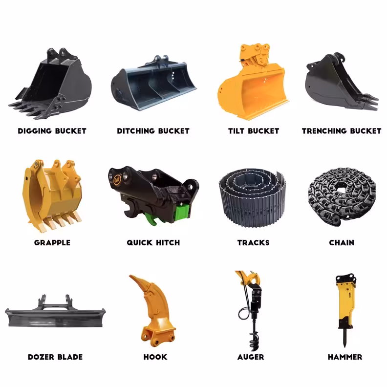 تأكد من أن جميع الملحقات بحالة جيدة ومتوافقة مع الحفارة. يتضمن ذلك التحقق من حالة الدلاء وأدوات القطع والأدوات الأخرى.