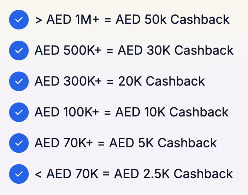 Visible listings range between AED 1,375,000 and AED 1,510,000, placing the CAT D8T bulldozer directly inside the AED 50,000 cashback tier.