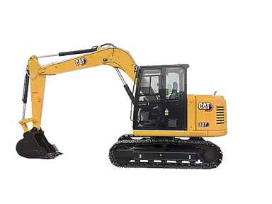 The Cat 307 is a compact radiator excavator weighing between ~7.27 t and ~7.6 t, powered by a 37.7 kW (50.6 hp) C2.4 Turbo Tier 4 Final engine. It digs up to ~4.12 m, reaches ~6.67 m, and has a transport width of ~2.2 m.